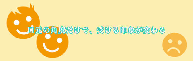 女優を目指す 方々が、メディアに写るためにまず最初に表情トレーニングを受けるのが「口角を上げること」と言われます。 口元が少し上に上がるだけで人は“柔らかくチャーミングで若々しい印象”と受け止めることが多く、第一印象が劇的に改善します。